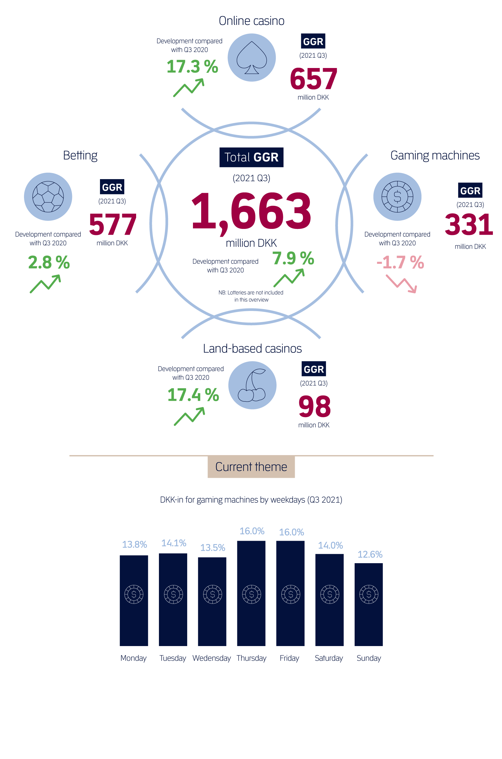 Figures from the Danish Gambling Authority’s quarterly statistics show that the total gross gaming revenue (GGR) for betting, online casino, gaming machines and land-based casino in Q3 2021 amounted to DKK 1,663 million. This is a year-on-year increase of DKK 122 million, which equals 7.9 percent. Only the gaming machine sector did not see an increase in Q3.