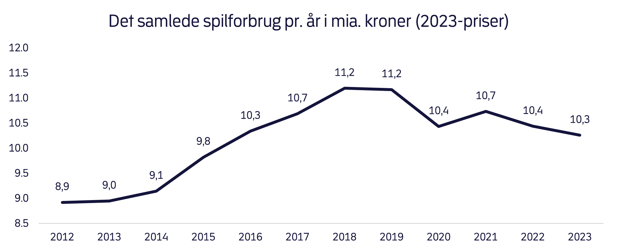 I 2023 brugte danskerne 10,3 mia. kr. på spil. Det er et lille fald på 1,7 pct. sammenlignet med forbruget i 2022. Siden 2018 er spilforbruget faldet hvert år, undtaget fra 2020 til 2021, hvor der var en stigning.