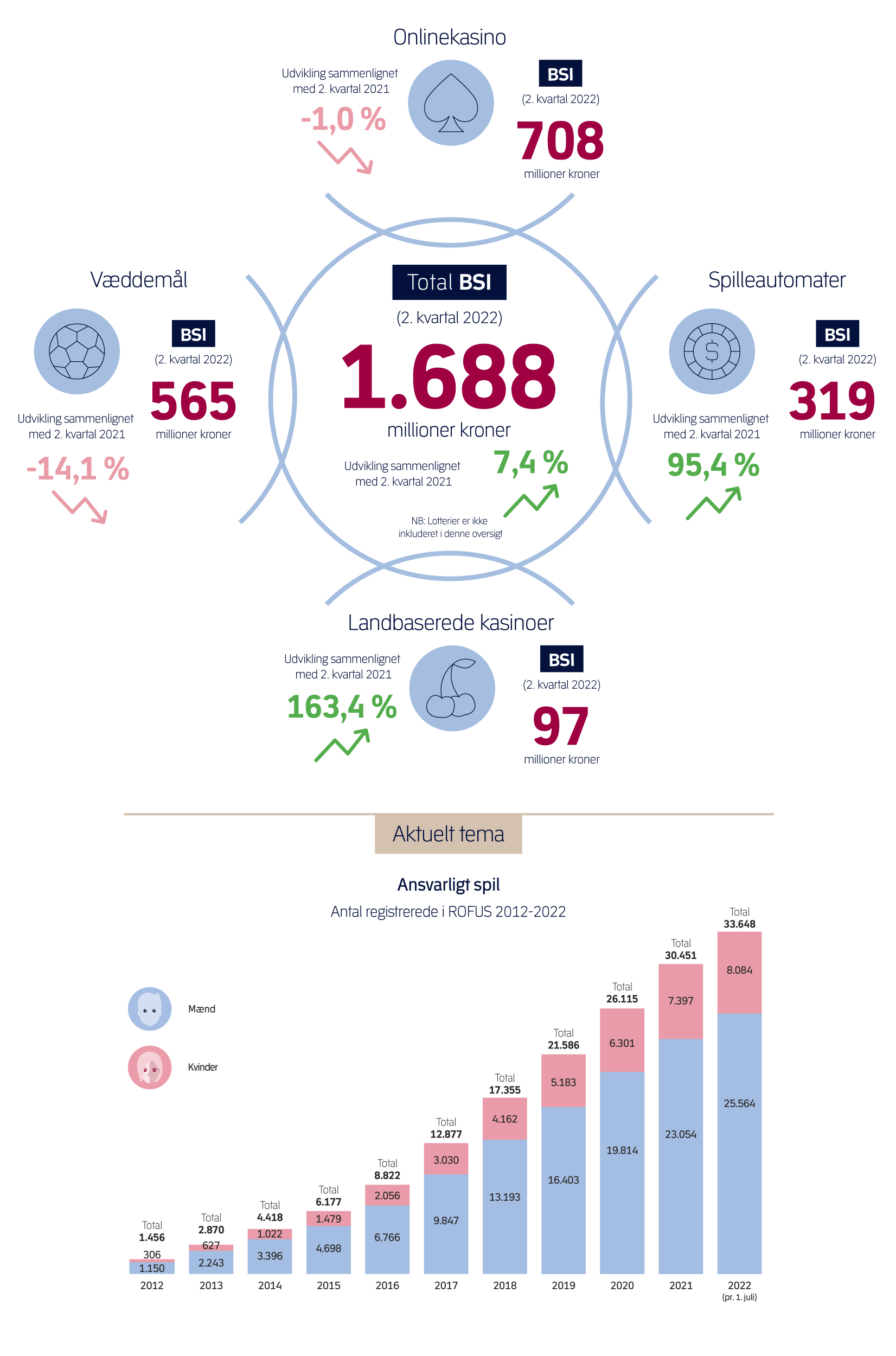 Tal fra Spillemyndighedens kvartalsstatistik viser, at den samlede bruttospilleindtægt (BSI) for væddemål, onlinekasino, spilleautomater og landbaseret kasino i 2. kvartal 2022 udgjorde 1.688 mio. kr. Det er en stigning på 116 mio. kr. sammenlignet med 2. kvartal 2021, hvilket svarer til 7,4 pct. Den samlede stigning skyldes især, at fysiske kasinoer, spillehaller og restaurationer har været åbne i hele 2. kvartal 2022, men var lukkede i en periode af 2. kvartal 2021 som følge af covid-19-restriktioner.